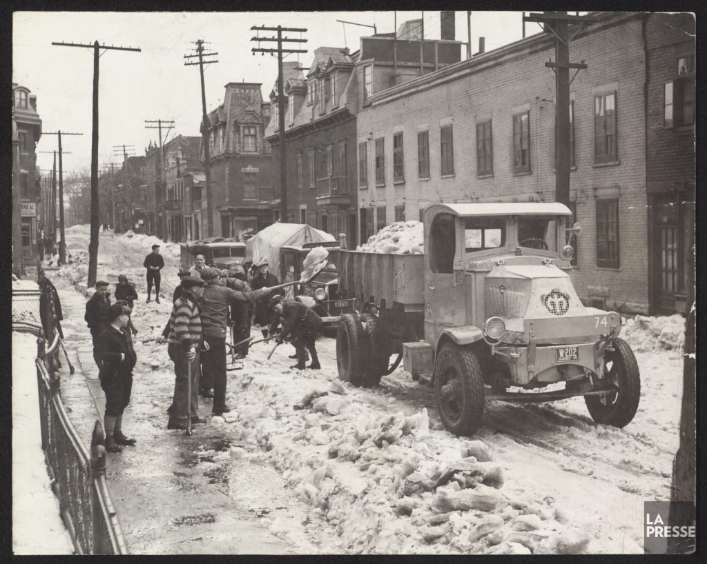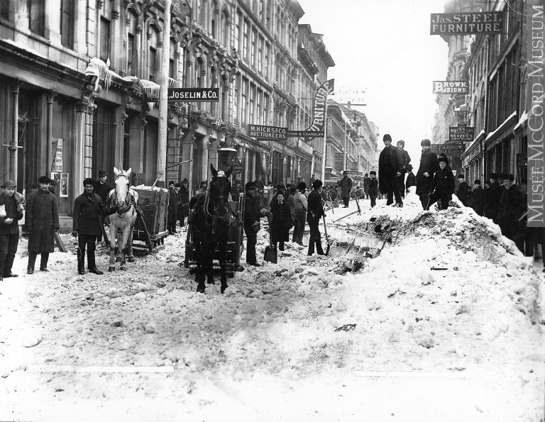 Grâce aux articles de journaux, nous savons que certaines tempêtes ont enregistré des précipitations équivalentes et même supérieures à la fameuse « tempête du siècle » de 1971. Or, avant la prodigieuse invention de la souffleuse par Arthur Sicard dans les années 1930, le déneigement se faisait essentiellement à la pelle avec des charrettes tirées par des chevaux et les Montréalais devaient dégager eux-mêmes les trottoirs et les rues jusqu’en 1905.